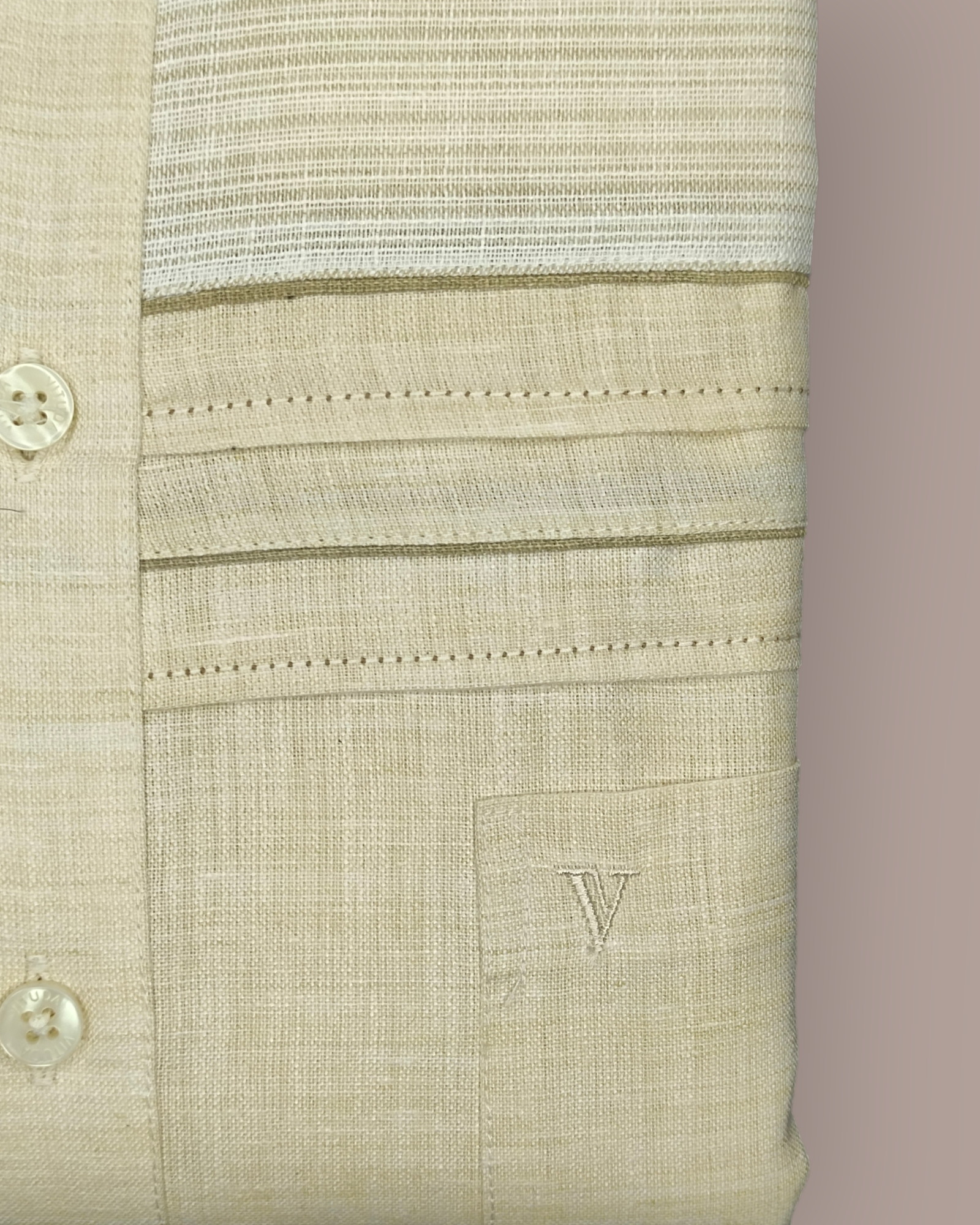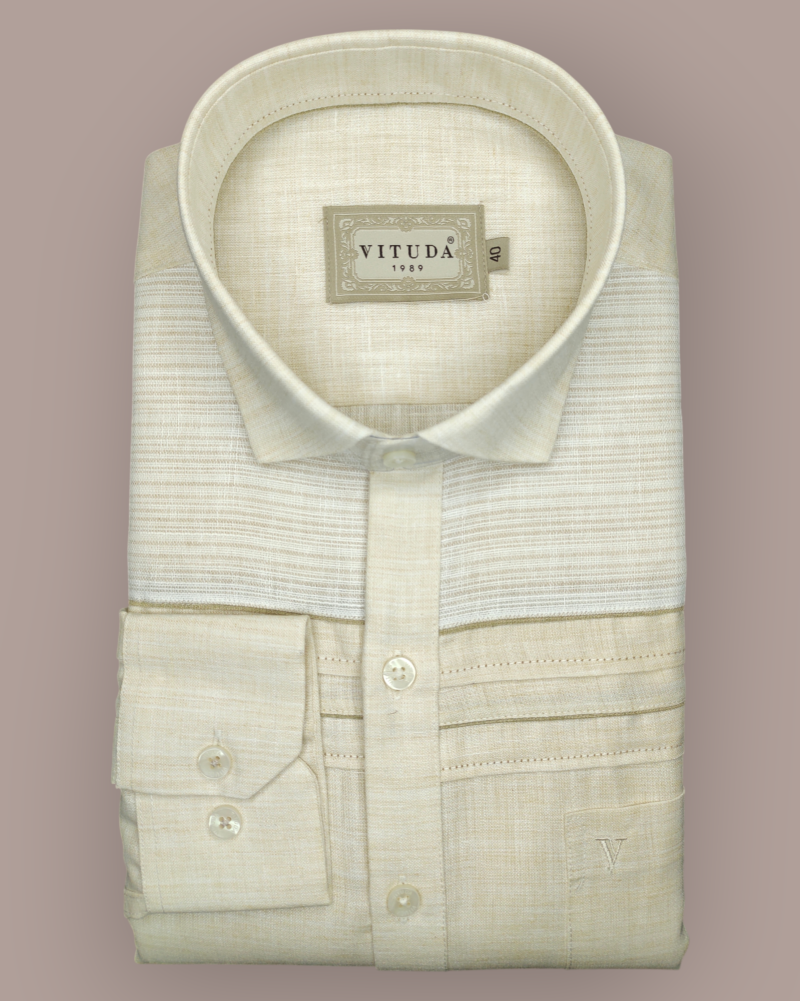 Elevate your everyday elegance with the Vituda Men’s Sand Beige Textured Shirt, crafted for men who value understated sophistication. Designed in a warm sand-beige tone, this shirt features a fine textured fabric enhanced by a subtle horizontal stripe panel across the chest, creating a clean yet distinctive look.