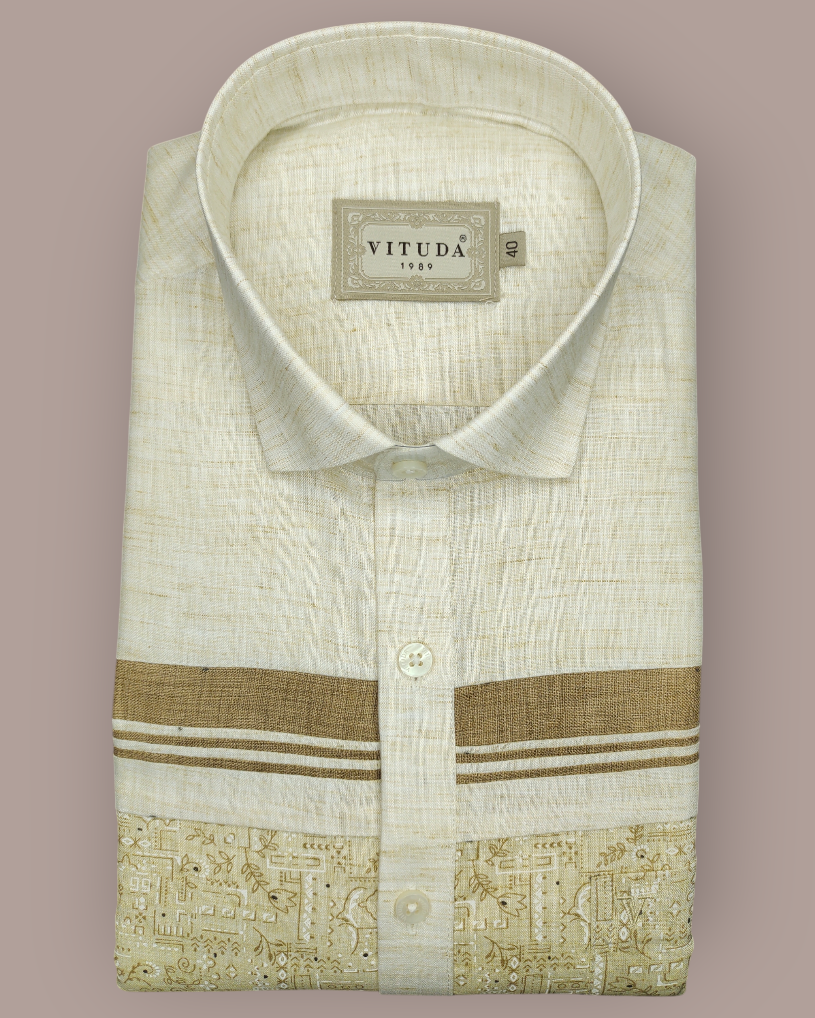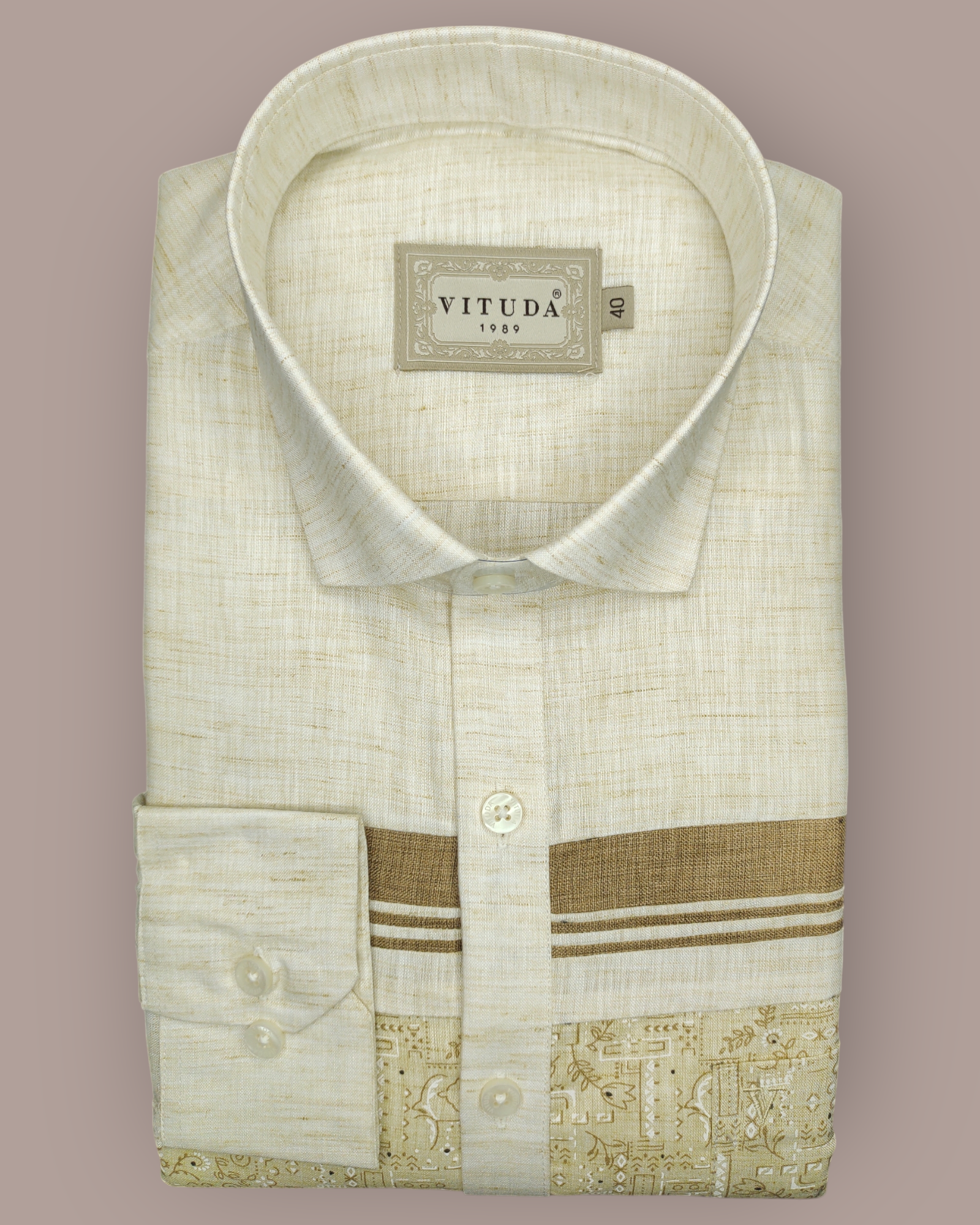 Elevate your festive wardrobe with the Vituda Men’s Cream Textured Shirt, thoughtfully designed with a distinctive heritage-inspired border panel. Crafted from premium textured fabric, this shirt showcases a refined cream base enhanced by earthy stripe accents and a subtle traditional motif at the lower panel—bringing together culture and contemporary elegance.