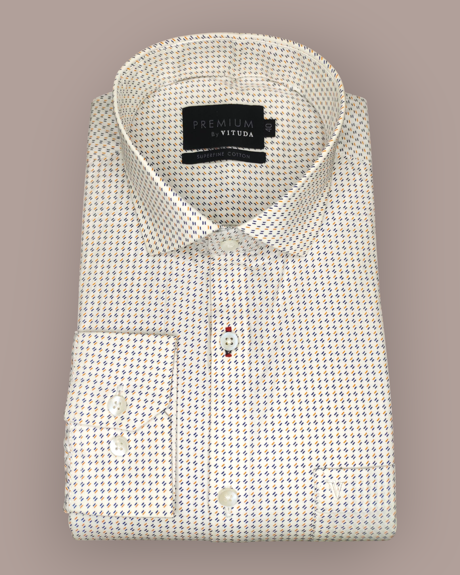 Elevate your collection with our exclusive Premium Printed Superfine Cotton Shirt by VITUDA. This piece features a subtle, tightly packed micro-geometric or dotted pattern in sophisticated tones of blue and gold/mustard yellow set against a crisp white backdrop, offering a refined, modern, and versatile look.