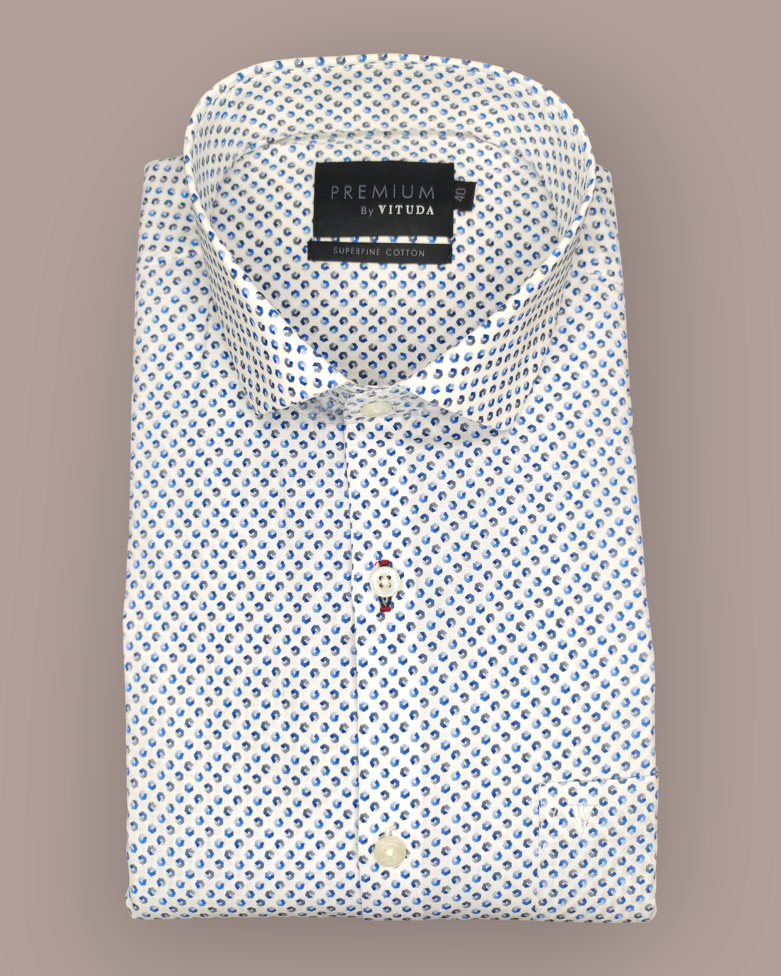 Elevate your casual and semi-formal wear with our exclusive Premium Printed Superfine Cotton Shirt by VITUDA. This piece features a sophisticated, tightly packed blue and white geometric or circular pattern, offering a fresh, modern, and refined look that is both understated and stylish.