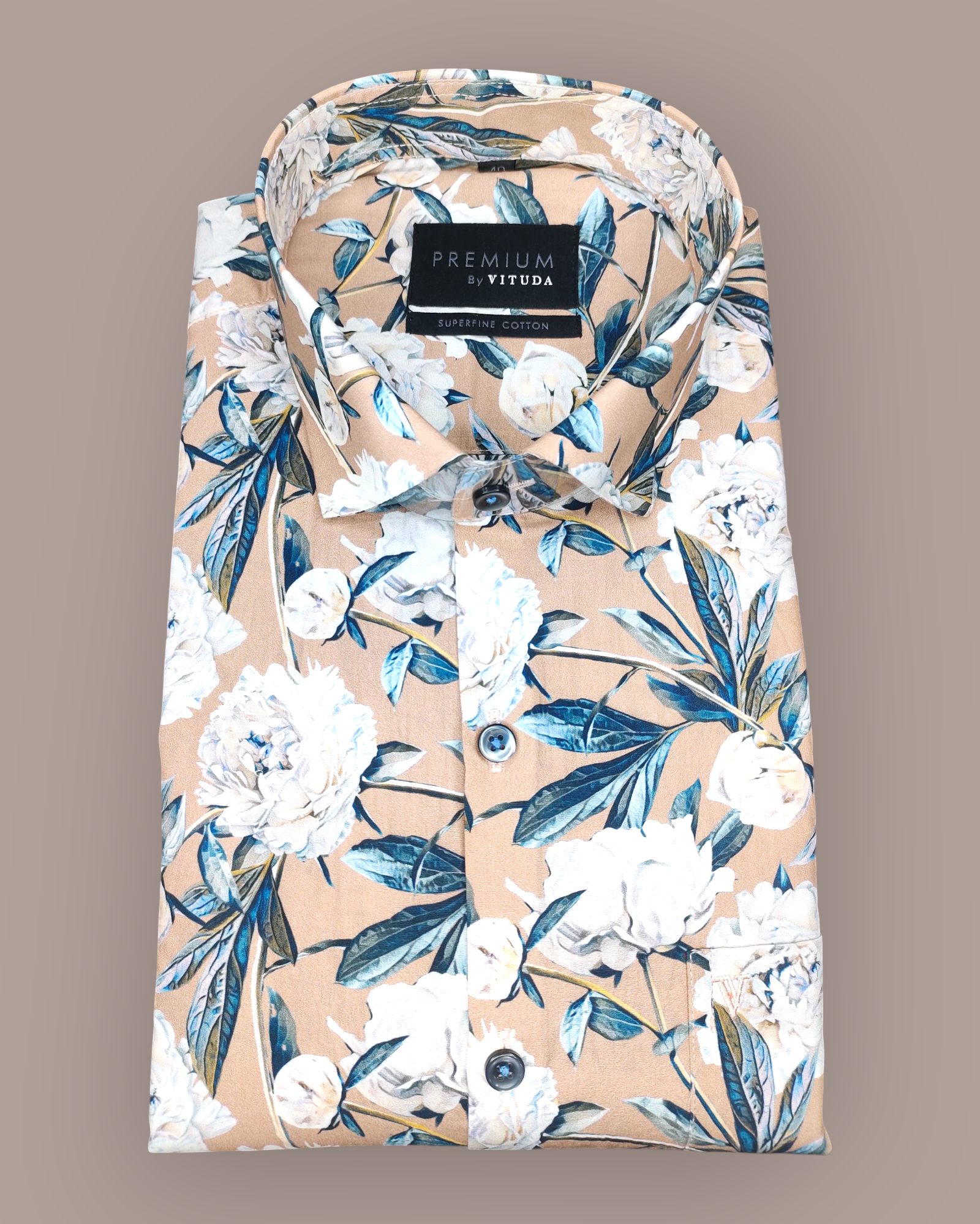 Elevate your collection with our exclusive Premium Printed Superfine Cotton Shirt by VITUDA. This piece features a striking all-over print of large white peony flowers and bold blue/teal leaves set against a sophisticated beige or sand backdrop, offering a fresh, modern, and eye-catching look.