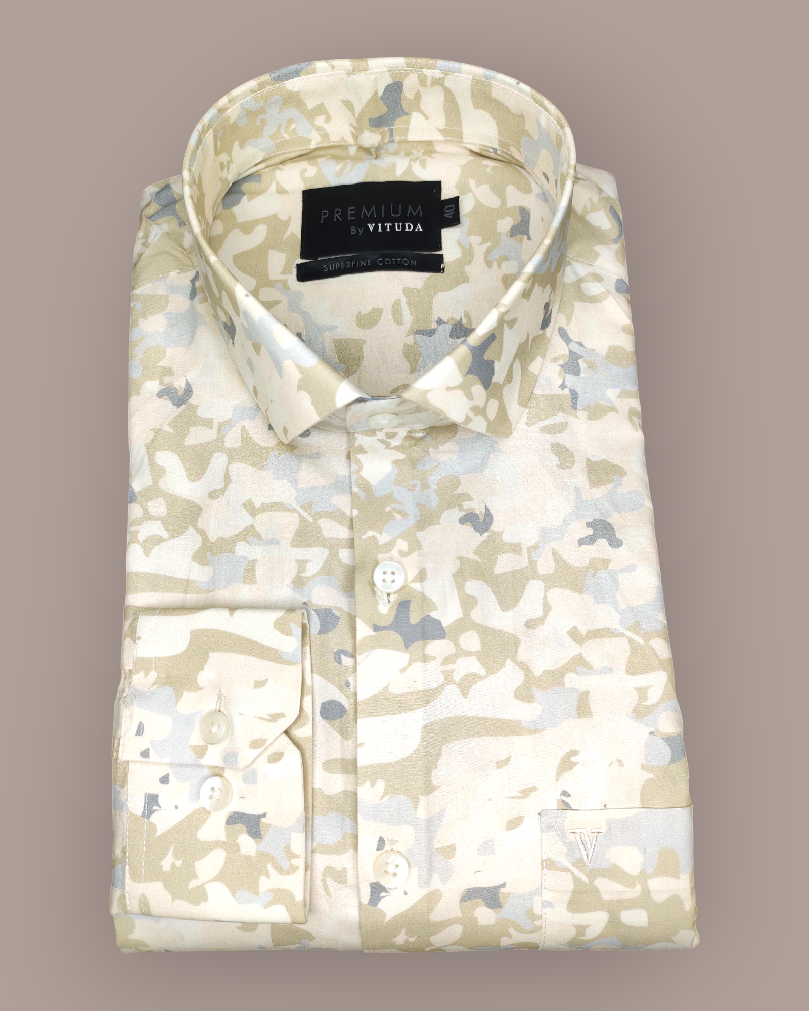 Elevate your collection with our exclusive Premium Printed Superfine Cotton Shirt by VITUDA. This piece features a sophisticated, all-over abstract camouflage pattern in muted tones of sand beige, off-white, and light grey, offering a modern, versatile, and eye-catching look.