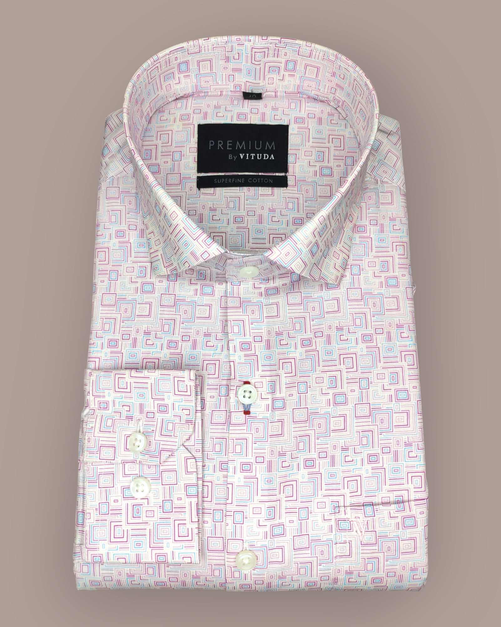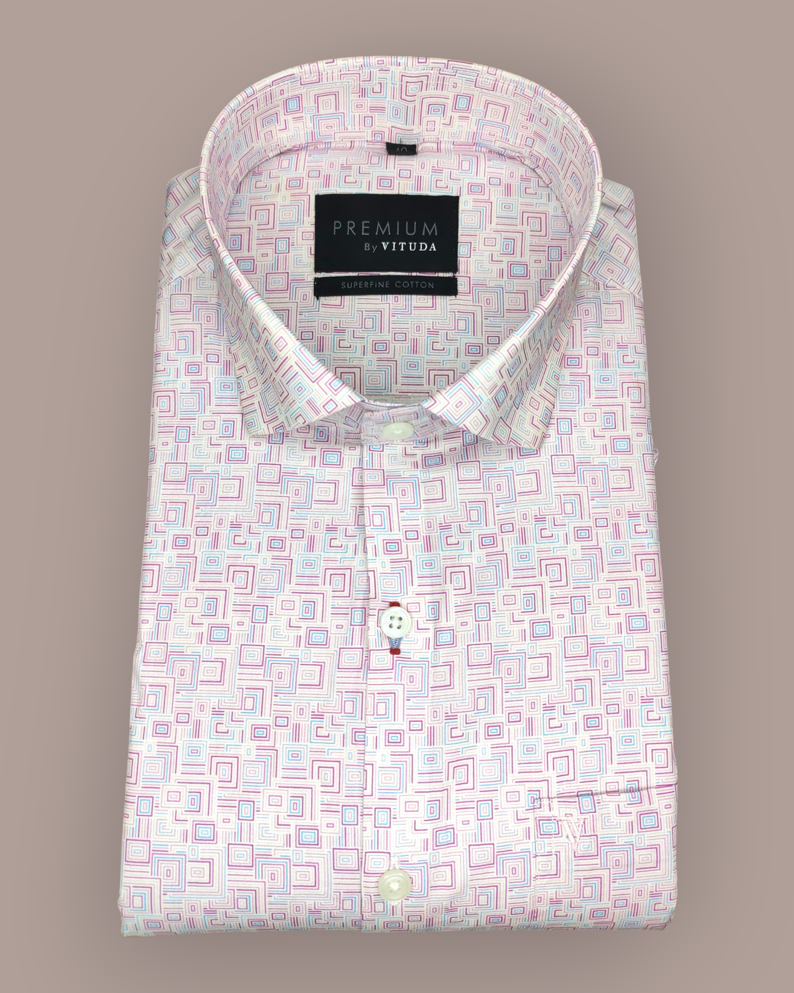 Elevate your collection with our exclusive Premium Printed Superfine Cotton Shirt by VITUDA. This piece features a sophisticated, all-over pattern of outlined geometric squares in vibrant tones of pink, light blue, and subtle hints of grey set against a crisp white backdrop, offering a modern, eye-catching, and refined look.