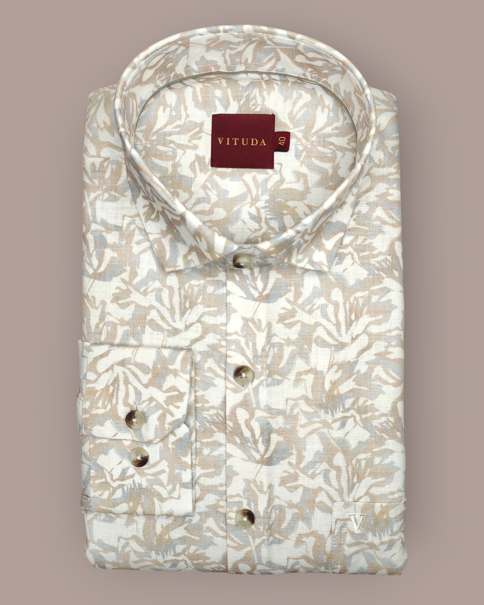Elevate your everyday style with the Vituda Men’s Premium Beige Leaf Abstract Printed Cotton Shirt—a refined blend of sophistication, comfort, and modern design. Featuring a soft beige and muted grey abstract leaf pattern, this shirt offers a calm, earthy aesthetic perfect for both casual and semi-formal occasions.