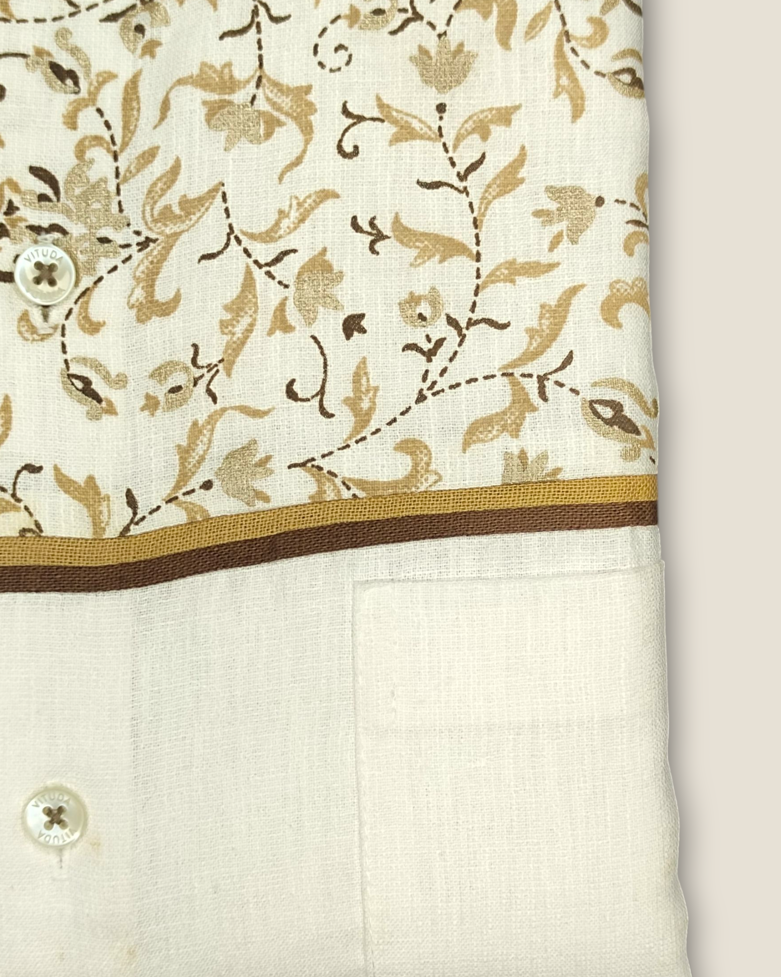 Discover timeless elegance with the VITUDA Embroidered Floral Shirt. Crafted from high-quality cotton, this shirt features intricate floral embroidery in soft beige and brown hues, creating a refined and sophisticated look. The delicate floral pattern and the contrasting stripes at the cuff and bottom hem add a touch of luxury to your wardrobe.