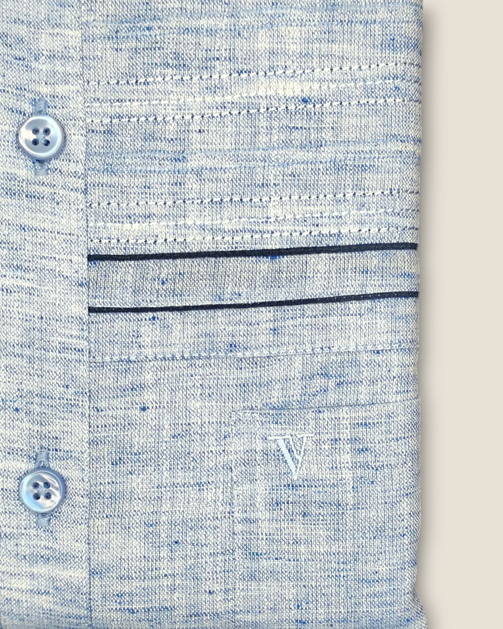 The Vituda Smart Fit Shirt in a refined blue textured fabric is the perfect combination of casual style and contemporary elegance. This shirt features a unique blue weave with subtle tonal detailing, creating a sophisticated and versatile look. The navy contrast collar and fine navy piping along the chest enhance its modern appeal, while the embroidered "V" logo on the pocket adds a touch of class. Designed with a smart fit cut, it provides a tailored silhouette that flatters your figure.
