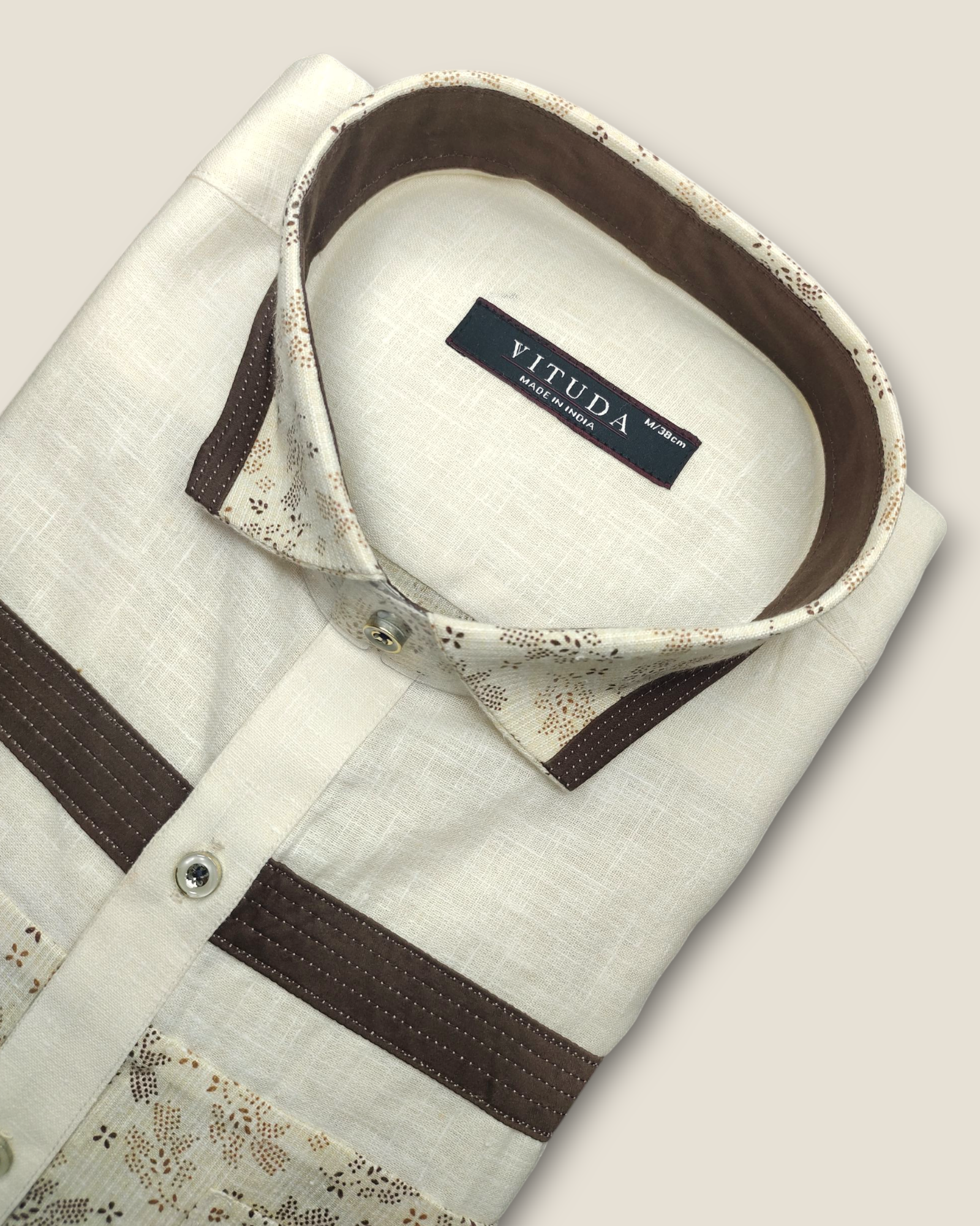 Embrace sophistication and style with the Vituda Designer Shirt, a timeless piece that combines comfort and elegance. This shirt features a soft cream fabric, accented with a stunning brown floral panel across the chest and lower half. The contrast brown collar adds a refined touch, making this shirt ideal for both casual outings and more formal events. The "V" embroidery on the pocket further enhances its classy appeal. With its tailored smart fit, this shirt promises a sleek and comfortable look that works for any occasion.