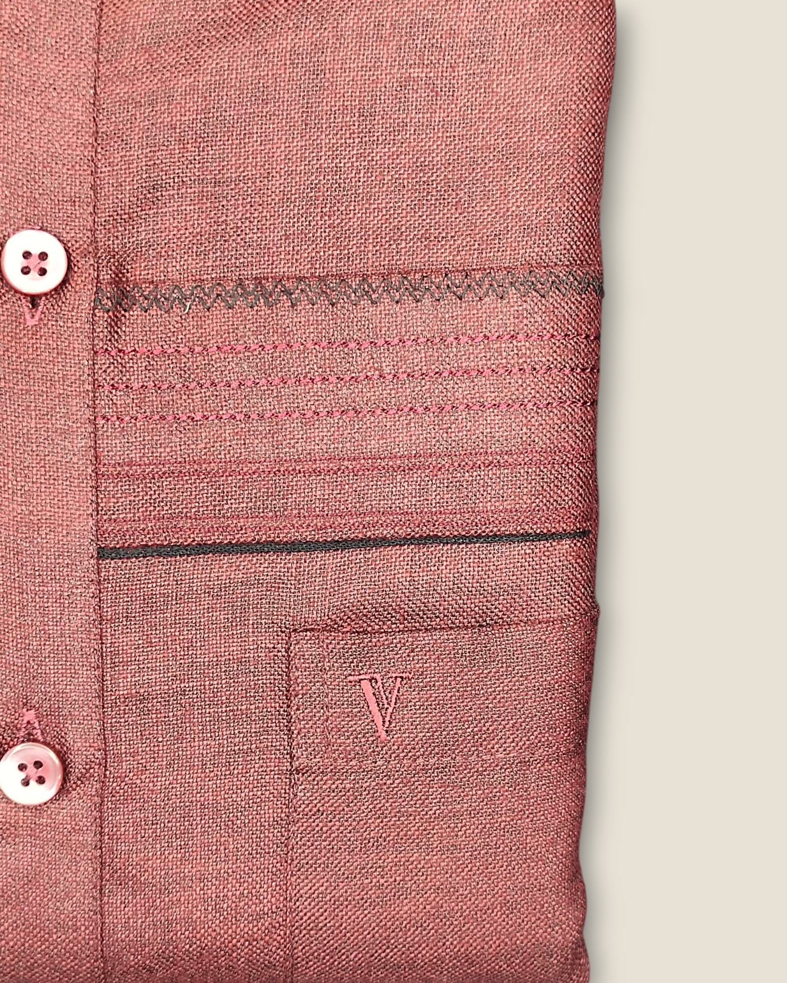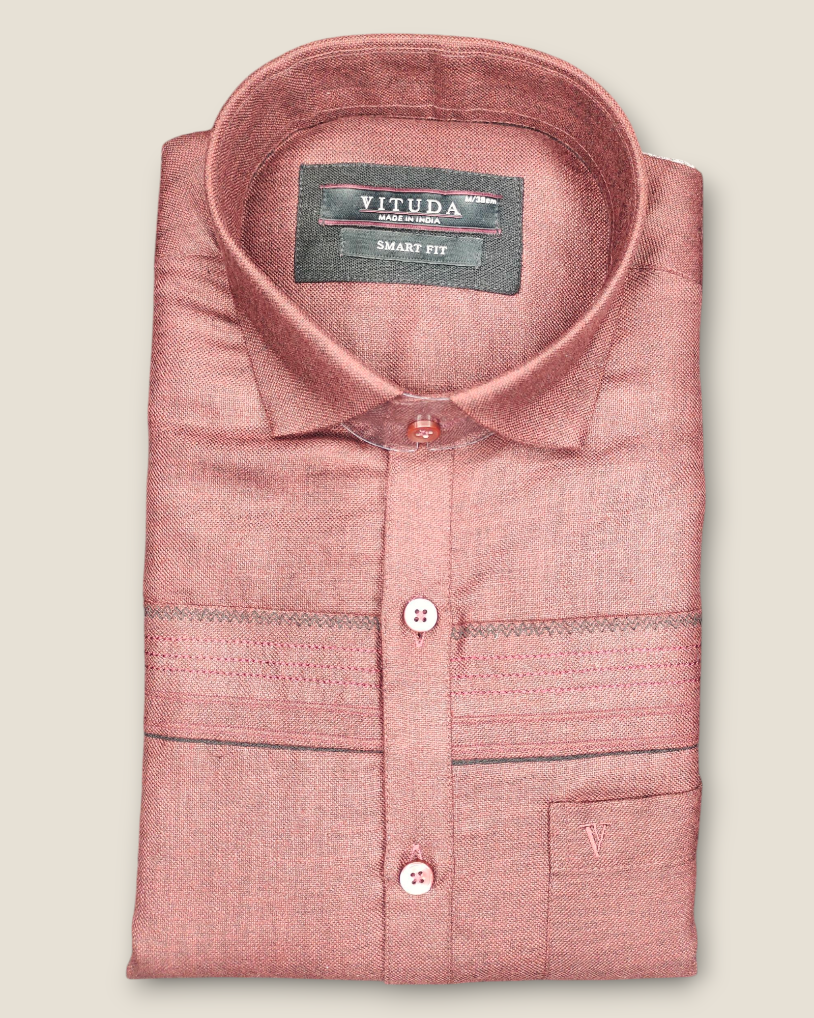 The Vituda Smart Fit Shirt in rich red is a perfect blend of elegance and modern design. Crafted from premium fabric, this shirt offers comfort and a sharp look, ideal for both casual and semi-formal occasions. The subtle embroidered stripes across the chest add texture and dimension, while the "V" embroidery on the pocket enhances its sophisticated appeal. The smart fit ensures a clean, tailored silhouette, making it a versatile choice for any event.